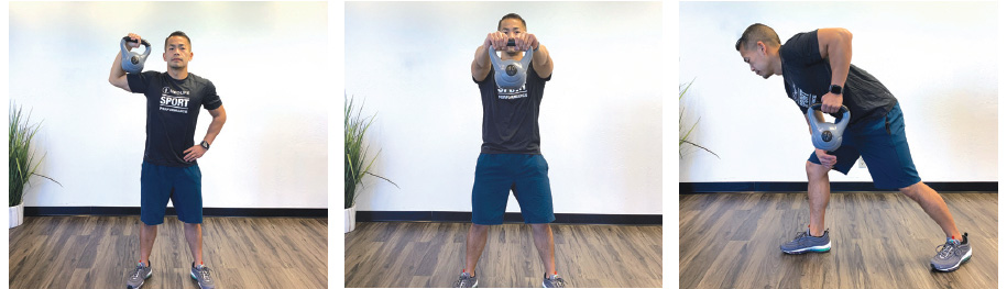 > Pull the kettlebell up to the torso, keeping your elbow tucked by your ribs.